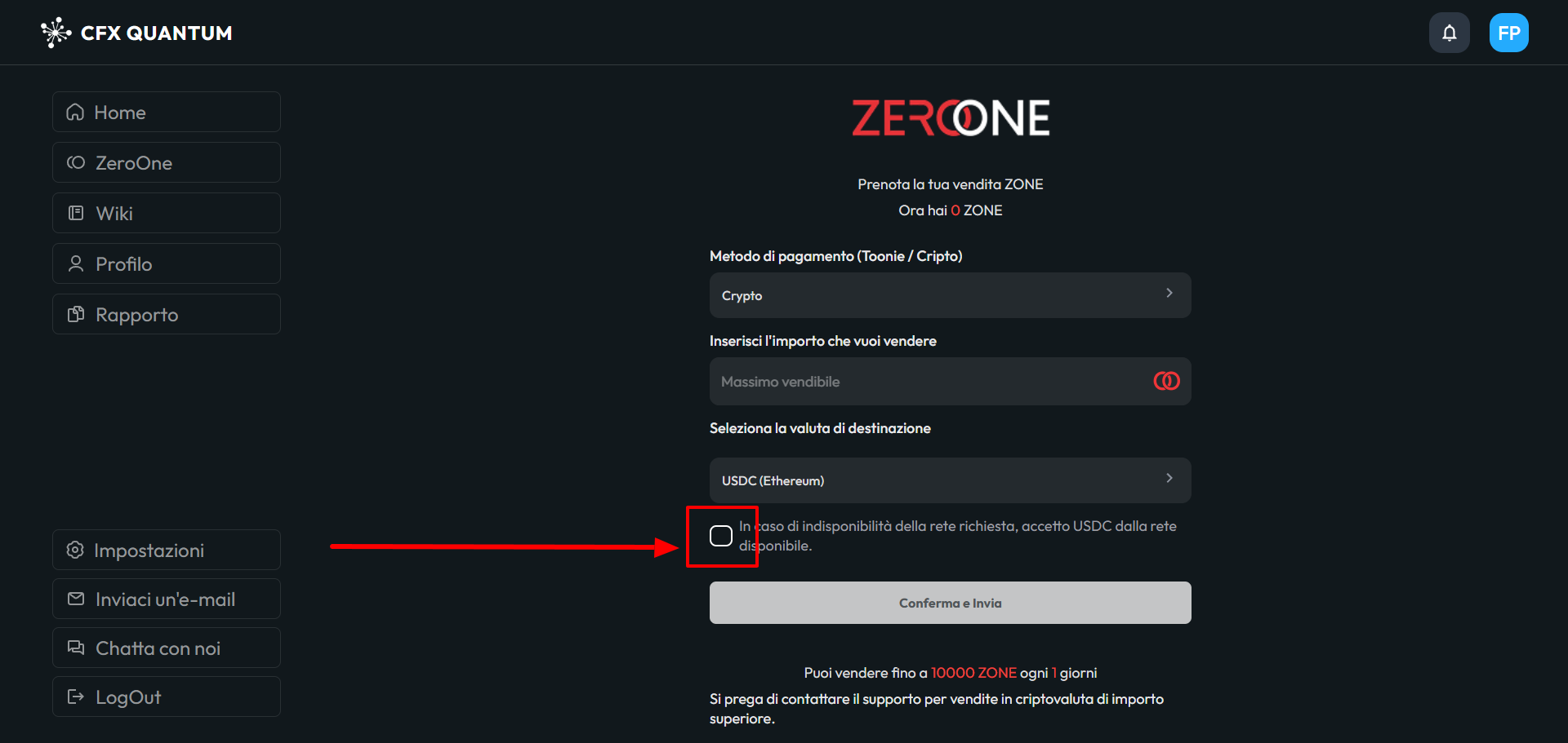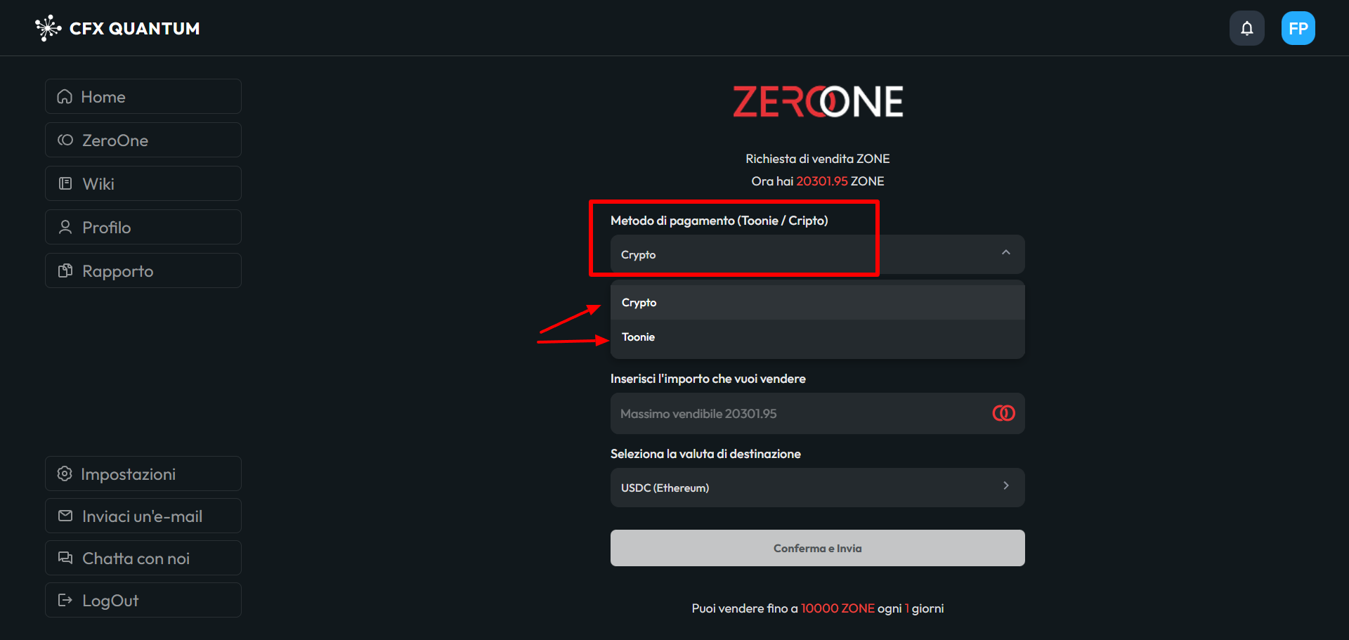 Scegliere dal menù a tendina la modalità di pagamento (crypto/Toonie)