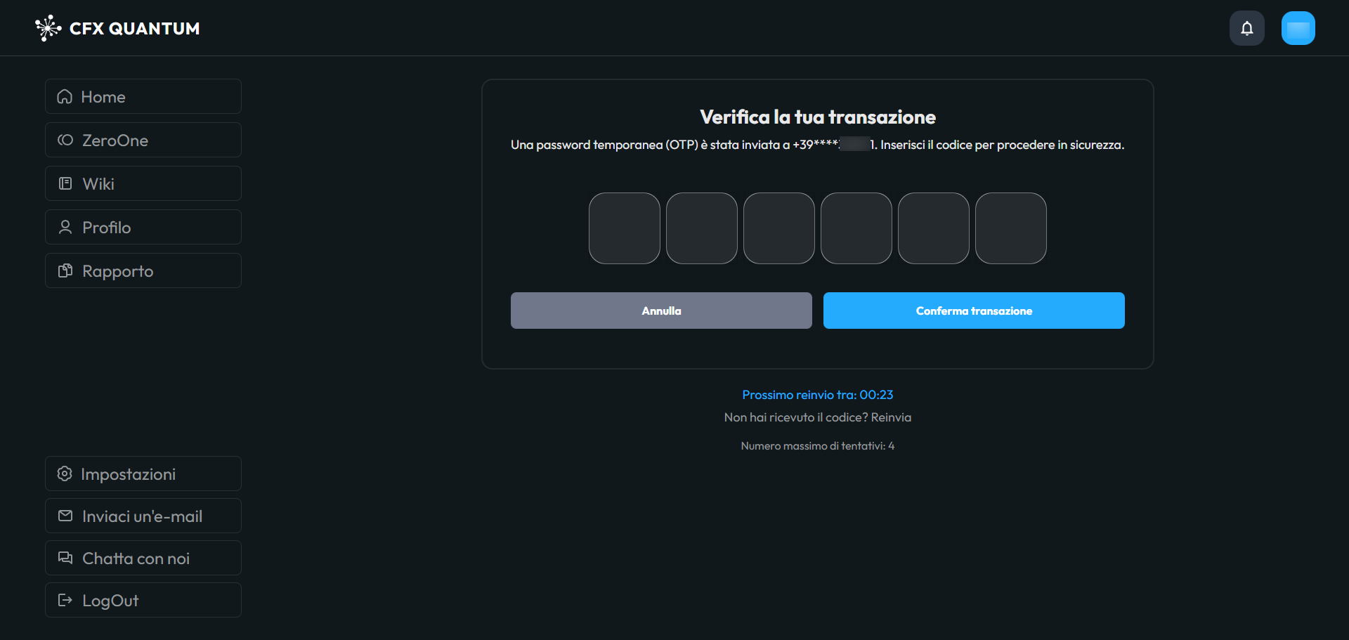 Il sistema invierà una password di 6 numeri che va inserita come richiesto